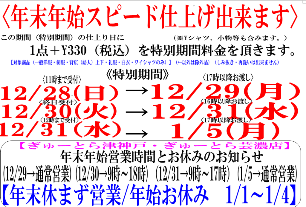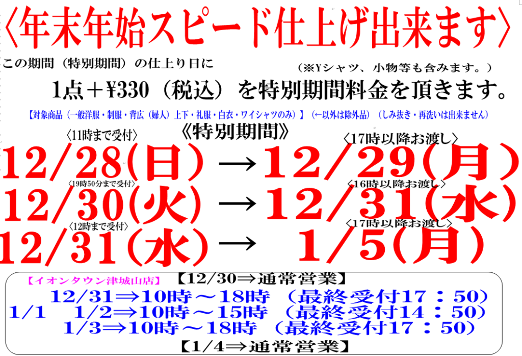 2025年12月12日 / 最終更新日 : 2025年12月12日 marusho ニュース 年末年始スピード仕上げできます! 今年も、早いもので年の瀬が迫ってきました。 年末年始に必要な方むけにスピード仕上げをやっています。店舗により適用が異なりますので、よく確認してご利用くださいませ。 【イオンタウン津城山店】 【ぎゅーとら津神戸店・芸濃店】